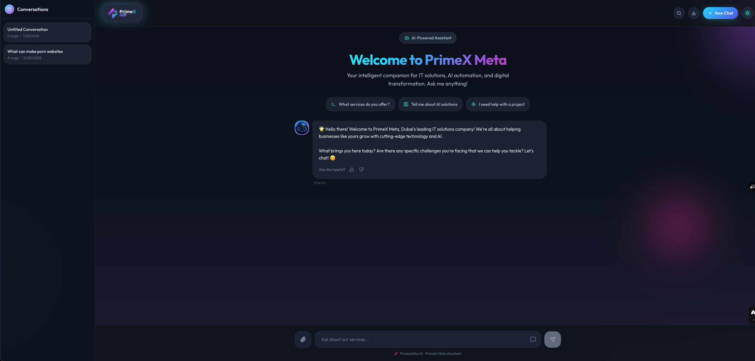 PrimeX Meta offers cutting-edge IT solutions that leverage AI automation and cloud services to transform businesses in Dubai, UAE. Their intelligent AI assistant provides customized support for various projects.